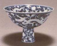 说 明: 此器是在未干的坯体上先刻划花纹,然后用青花染地,再施釉烧制成蓝地白花纹饰,使纹饰更生动活泼,是在元代基础上发展起来的.