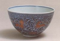 说 明: 胎质洁白细腻,釉层肥厚,略呈青白色,底有釉.青花色泽青蓝浓艳,青白相间的海水中有红彩海兽奔腾于波涛中,神态生动,同类产品传世甚少.