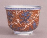 说 明: 此器采用釉下青花与矾红两色描绘九龙闹海纹饰,表现了制瓷匠师们在构图及用色方面的高超技艺.
