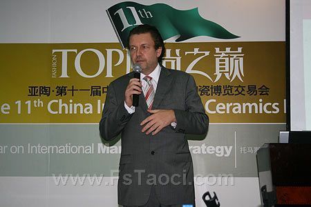 4月19日上午,佛山国际陶瓷博览交易会的第二日,中国陶瓷城大会议室座无虚席,佛亚展览公司总裁托马斯先生正在这里进行一场以陶瓷产品国际营销为主题的讲座。