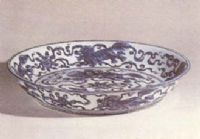 说 明: 盘形制较大,制作规整.胎质细润,釉质晶莹肥厚.狮子体态灵活轻盈,形象自然生动,构图布局合理.青花色泽浓艳,浓艳处基本无铁锈斑点,这在同期的青花器中较为少见.