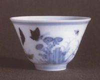 说 明: 杯底青花双方栏楷书"大明成化年制"款.胎薄体轻,纹饰细腻,施彩淡雅,轻盈秀丽,制作工艺极为精致,是成化彩瓷中的精品.