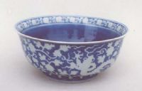 说 明: 此碗青花色如宝石蓝鲜亮,纹饰部位为白色,蓝白互映,色调明快.底青花双圈内书"大明嘉靖年制"六字款.
