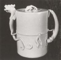 说 明: 通体施象牙白釉,釉汁莹润纯净.胎质洁白细腻,正中印有方章,字迹不清.此壶造型端庄,构思巧妙,制工精细.