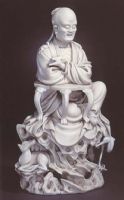 说 明: 塑像整体雕刻线条刚柔相济,老人的神情意态淋漓尽致,衣纹舒展,自然飘逸,是德化窑中的精品.