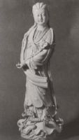 说 明: 白胎坚细,满施牙白色釉,开冰裂纹小片,甚洁净.身首比例适度,宽额方面,容颜慈祥传神.此大型而完美的明代瓷像,是潮州窑瓷塑的杰作.