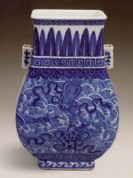 说 明: 颈部纹饰层次感强,回纹则显得古朴庄重,器身海水纹气势宏大,且釉色稳定、深厚.