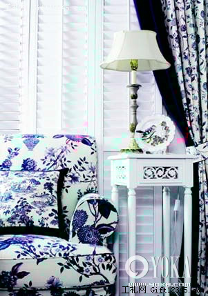 1.单人扶手沙发用了青花图案的面料,清雅不俗,和白色镂空雕装饰花架相得益彰。一侧的窗帘也和沙发相互呼应,衬以深蓝色天鹅绒衬布,更显高雅别致。 2.用青花图案的茶壶搭配白色英式骨瓷茶盘,正好调和了中式茶壶的端肃,加上古典青花图案的餐巾,一个人的下午茶因此多了几分自在与优雅。