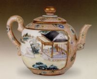 说 明: 此壶上的烹茶图采用了西洋绘画中的"透视"技法,产生很强的纵深感,且诗与画相配,可谓相得益彰.据载,诗为乾隆七年弘历回圆明园途中遇雨而作,后命人题写绘画在此壶上.