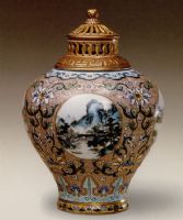 说 明: 此瓶造型饱满,色彩绚丽,四个圆形开光减轻了装饰上的堆砌繁缛感,可谓设计上的成功之举.