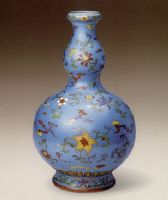 说 明: 葫芦式瓶在清乾隆时曾风靡一时,除了各种单体的以外,还有以三个相同的葫芦连为一体的.装饰品种则有青花、粉彩、仿汝釉、仿官釉、天蓝釉、粉青釉、茶叶末釉等.