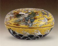 说 明: 此盒盖绘粉彩龙凤戏珠,形态生动.器物形制小巧玲珑,是乾隆粉彩中的佳作.
