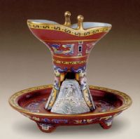 说 明: 此器仿青铜器式样,清宫档案称之为"江山一统爵盘".据载,乾隆八年御窑厂奉旨烧制的"洋彩"器中就有此种爵盘两件,一为胭脂红色地,一为黄色地,制作都极为精细.