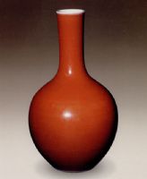 说 明: 此瓶的造型模拟传统的天球瓶,但比例缩小,既保留天球瓶的雄伟气势,又给人精巧新颖之感.霁红釉呈色浓艳,与规整优美的造型结合得天衣无缝,显示出官窑瓷器规整而有气势的风格.