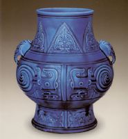 说 明: 此器造型和图案均模仿古铜器,在孔雀绿釉的衬托下,颇显古朴凝重.