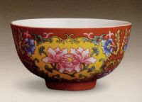 说 明: 整个画面纹饰极富立体感,与珐琅彩极为相似.道光较雍正时的粉彩瓷色泽浓艳,纹饰繁缛,常见这一时期的粉彩瓷多以在色底上进行彩绘为特征.