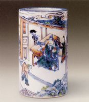 说 明: 道光朝官窑瓷器多图案繁缛,线条纤细,所绘人物的神态略逊康、乾时期.但此件太白醉酒图笔筒形体小巧,纹饰生动,是道光官窑瓷器中难得的一件佳作.