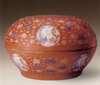 图片名称: 红地粉彩花蝶开光龙凤纹盖盒