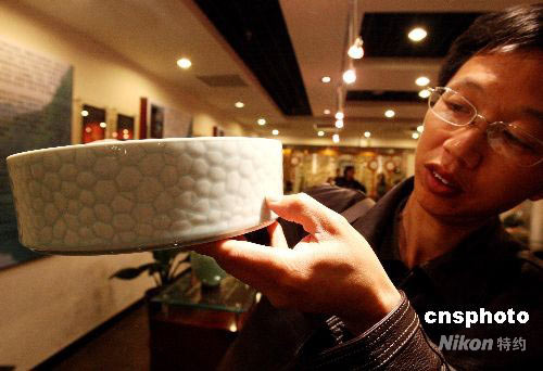 4月25,中国龙泉青瓷珍品展在北京合璧兴陶瓷艺术馆举行,龙泉青瓷以独创的粉青、梅子青釉色而著称,龙泉哥窑有“金丝铁线”之美称,列为宋代五大名窑之一;而龙泉弟窑则以晶莹润泽的青釉闻名天下,被誉为“青瓷之花”。是次展览是由中国陶瓷工业协会及浙江省龙泉市政府主办,毛正聪、徐定昌、陈爱明等十余位当代大师纷纷创作并烧制青瓷作品。图为珍品《期盼》则以奥运比赛场馆国家游泳中心水的立方为设计蓝本,内部釉层饱满晶莹宛如水波,外部配以水分子外形的纹饰,将浙江龙泉的传统青瓷文化与现代奥运文化相结合,形成了人们对水的立方的记忆载体,表达了对奥运的向往和期盼,完全契合北京奥运会绿色、科技、人文的三大核心理念。
