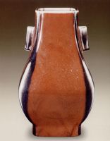 说 明: 窑变釉到了晚清多以红色为主色,交相辉映着黑色斑块,红、黑之间夹杂着自然流畅的青绿色,这种窑变釉为现代景德镇"三阳开泰"釉奠定了工艺基础.