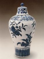 说 明: 梅瓶有盖,宝珠钮,盖口外撇,内有一中空柱.白砂底,胎质细腻如绸.纹饰各层次间以弦纹相隔.