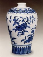 说 明: 明初永乐、宣德时期梅瓶口多为小唇口,颈为弧形,肩部亦较丰满,自口至肩、足部线条变化明显且优美.折枝果纹饰也是此时青花器中较多见的装饰题材.