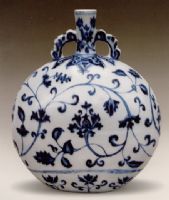 说 明: 此器胎薄体轻,青白色,釉面光润.整个纹饰色泽浓淡适合,浓艳处聚有铁锈斑点.是永乐时期青花瓷中的佳品.原系热河行宫陈设之物.