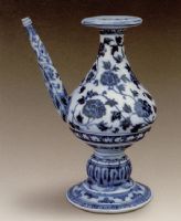 说 明: 此器系西亚文化影响的产物,造型雅致.梵语谓之"净瓶"、"军持".用"苏麻离青"料绘缠枝莲纹,纹饰线条纤细有力,色彩艳丽.