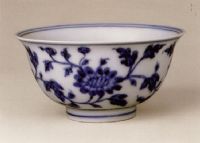 说 明: 此碗胎体较薄,青花纹饰精细,所绘花叶较饱满,青花呈色浓艳,釉质细润,白中泛青,足底无款识.