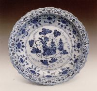 说 明: 此盘图案结构繁密,色调浓艳.有结晶斑点,浓重处凝聚成黑青色或藏青色,有金属的锡光色泽.胎细白,釉肥润,是明代景德镇官窑中的精品.