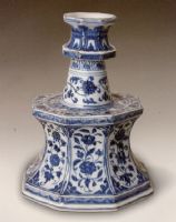 说 明: 八角形烛台是明代早期根据国外市场的需要而生产的,因此这一器型是当时特有的形制.此件通体绘十层纹饰,图案丰富多采,造型稳重别致.