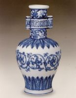 说 明: 此瓶系按汉代铜投壶式样烧造而成,造型古朴,肩、胫部之蕉叶纹与腹部缠枝花纹之间留有较大空白,既起到衬托主题纹饰的作用,又使整体纹饰布局亦显得疏密有致.