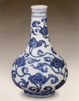 说 明: 宣德官窑瓷器上首创署六字年款,但落款位置不固定,故有"宣德年款遍器身"的说法.此瓶落款于近口沿处,除此之外,尚见有于外底、内底、肩部、腹部、流部、折沿下部位书款.