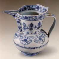 说 明: 施青色的透明釉.构图疏密相间,纹饰清新典雅.瓷器僧帽壶出现于元代,明代景德镇官窑生产的僧帽壶,上面还有藏文吉祥语,应是朝廷用来赏赐西藏上层贵族的.