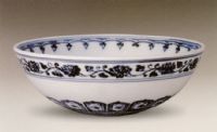 说 明: 此种卧足碗始烧于永乐时期,宣德时继续烧造.其造型和纹饰均模仿西亚伊斯兰国家金属器.明代万历及清代康熙时均仿烧过永、宣青花卧足碗.