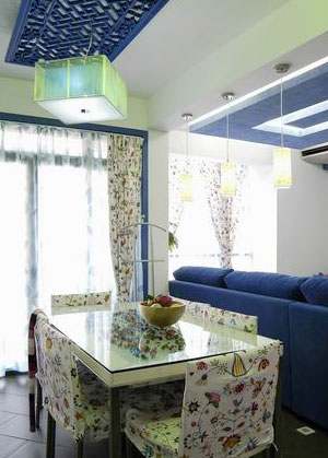 餐厅采用了颜色丰富多彩的软装,与客厅冷色调相比起来多了份喜庆的味道。餐厅与客厅采用了现在比较流行的开放式,这使空间看起来更具整体性与时尚性。为与客厅功能区分除了在吊顶上大做了文章外,还在餐厅与客厅的分界安装了吊灯,这样既起到了区域划分作用又节约了资源(也可以用珠帘做隔断,珠帘最好采用透明的水晶珠,再安装上射灯,灯光打上去出来的效果也是很不错。但最好别用布料这会使空间变得很小缺乏大气感)。餐厅的花板吊顶把中式风格表现的很到位,这样的装饰表现也是比较少见的,一般这样的装饰是做在墙壁上的,但不可否定的是这样设计确实很有中式的韵味。