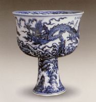说 明: 碗造型端正,胎体厚重,青花色调浓艳,系以"苏麻离青"料绘画而成.纹饰生动,龙态有兴云播雨之势.