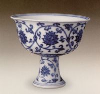 说 明: 宣德青花高足碗的式样很多,此为其中之一.此碗内底有青花双圈"大明宣德年制"六字双行楷书款.