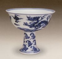 说 明: 胎体洁白,釉面光亮.无论色釉、图案花纹、造型都十分完美.外壁用进口青料绘以浓艳雄健的龙纹,高足绘火焰纹.碗心有"大明宣德年制"青花楷书款.