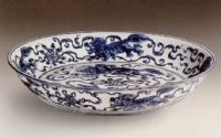 说 明: 此盘形制较大,制作规整.胎质细腻滋润,釉质晶莹肥厚.狮子体态灵活轻盈,形象自然生动,构图布局合理.青花色泽浓艳,浓艳处基本无铁锈斑点,这在同时期的青花器中较为少见.