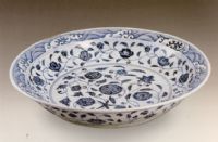 说 明: 大盘造型端雅规矩,图案清新爽朗,流利活跃.此盘用途一作宫中盛大宴会的盛食器,或作摆饰于厅堂书房的陈设工艺品,是极雅致华贵的.