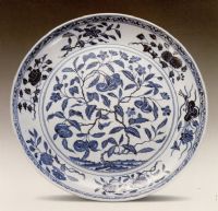说 明: 胎质细腻,有红色斑点,釉色白中泛青.能成功烧制如此大盘,反映了景德镇官窑高超的制瓷技艺.底有"大明宣德年制"楷书款.