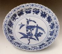 说 明: 花瓣口,扳沿,细白砂底,制作精致.鸟姿生动活泼.青花纹饰色泽浓艳.