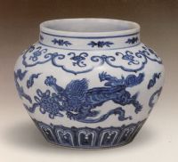 说 明: 胎质细腻白晰,釉色白而微失透.青花色泽鲜艳,青中泛蓝,浓处呈黑色.狮子形态生动逼真,为宣德官窑青花瓷器中难得的佳品.