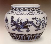 说 明: 此罐外底有青花双圈"大明宣德年制"六字双行楷书款.形体饱满,画面布局疏朗,纹饰生动自然,青花发色浓艳,堪称宣德青花瓷器中的佳作.