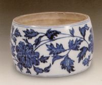 说 明: 鼓式,胎质细腻,器内无釉.青花色泽浓艳,略有褐斑及凹凸感,有自然晕散.已失盖,器破裂,仍弥足珍贵.