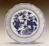 说 明: 十瓣葵花式洗是宣德瓷器中常见器型,品种有青花、红釉、蓝釉白花、仿汝釉等。青花器的装饰题材有团龙、团凤、团龙凤、莲池鱼藻及折枝花果纹等。