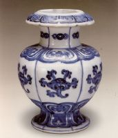 说 明: 胎白质细,呈六瓣瓜棱形.造型别致,釉色莹润,青花结晶斑块明显,是一件少见的佳品.