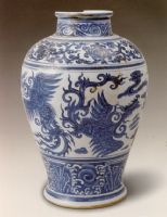 说 明: 此件整体古朴浑厚.胎体坚实厚重,青花呈色蓝中泛灰,多有铁锈斑,但不入胎骨.其主题纹饰充分表现了飞凤的曲线美和运动美.