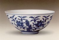 说 明: 碗胎质较薄,釉质细腻滋润,青花呈色淡雅,是成化时期青花瓷器中的代表作品.底有青花双圈"大明成化年制"双行六字楷书款.